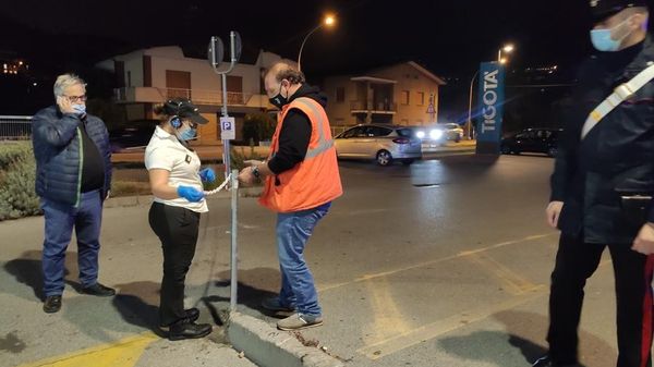 Anche il sindaco sul posto con i tecnici per la posa della catena per evitare assembramenti e contagi