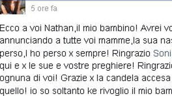 Struggenti parole su Facebook della giovane donna, disperata per la perdita del piccolo. Oggi l’autopsia