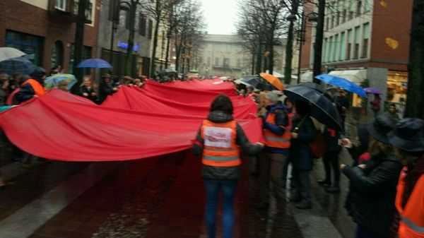 Merate, il maltempo non ferma la manifestazione In piazza Prinetti srotolato uno striscione lungo cento metri