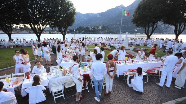 Fiori rossi, tovaglie algide, candidi tovaglioli in lino e altri in cotone finemente ricamati