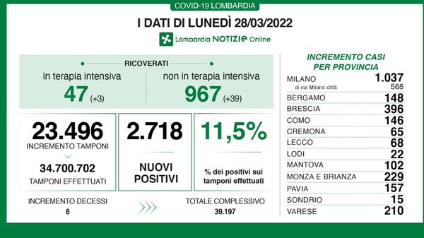 Altri otto decessi in Lombardia a causa della pandemia
