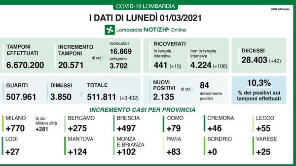 Covid: 403 casi a Como, 180 a Lecco e 72 a Sondrio In Italia 22.865 positivi con 339 vittime