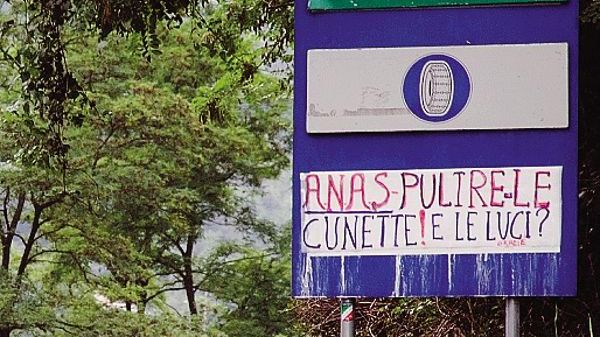 All’uscita di Chiavenna, impossibile non notare lungo la statale l’eloquente invito Galleria Cresta ancora al buio, asfalto colabrodo e vegetazione selvaggia