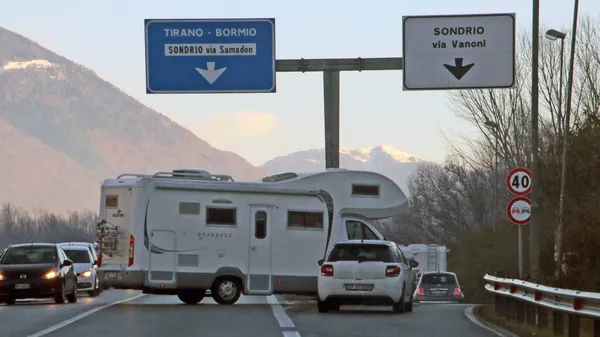 Contro esodo Due ore e venti minutì da Bormio a Tirano. Inversioni pericolose a U di due grossi camper. Nessun incidente ma rallentamenti per tutta la giornata