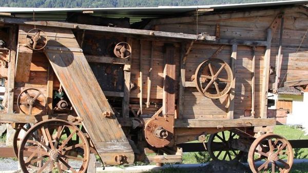 L’antica mietitrebbia fu esposta la scorsa primavera in piazza del Kuerc dopo i restauri Adesso si trova in un magazzino: «Ma vogliamo collocarla nel giardinetto in via Nesini»