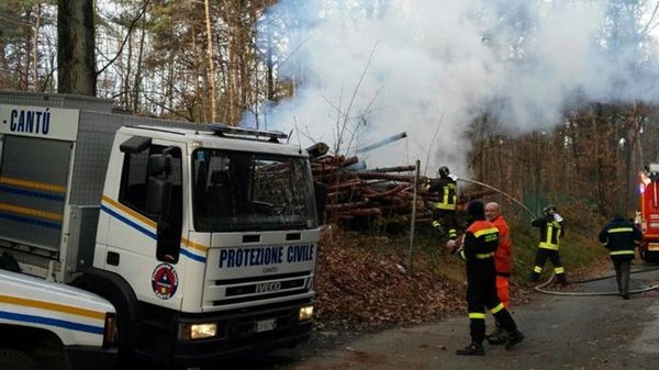 Lungo lavoro questa mattina per pompieri e volontari della Protezione civile nel bosco a lato della pista di volo di Verzago