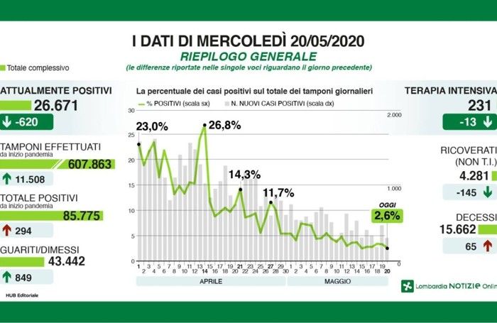 I dati sui contagi. 65 nuovi decessi in Lombardia