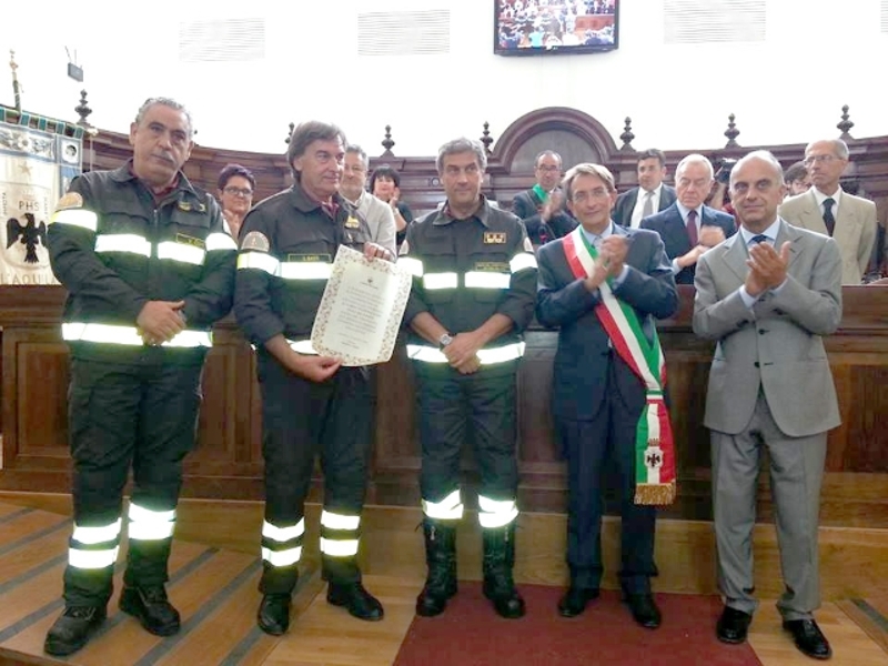 (ANSA) - L'AQUILA, 27 AGO - Cittadinanza onoraria dell'Aquila alcorpo dei Vigili del Fuoco. La cerimonia è avvenuta nella nuovaAula consiliare dove si è svolto un Consiglio comunalestraordinario cui ha preso parte il sottosegretario agli Internicon delega specifica, Gianpiero Bocci, il prefetto di Milano,Francesco Paolo Tronca, capo dipartimento all'epoca del sismadel 6 aprile 2009, l'attuale responsabile, Alfio Pini. Presenteanche Gianni Letta, e decine di aquilani. 'Bella pagina per ilPaese', ha detto Bocci.