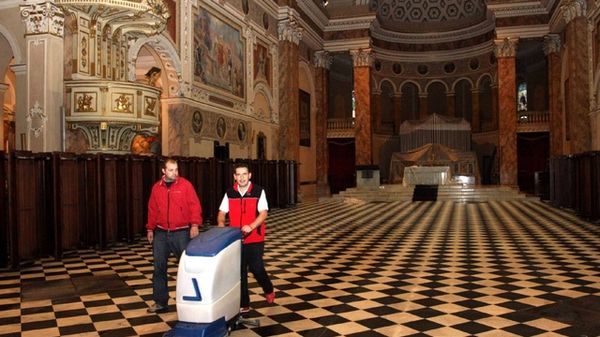 Controlli e pulizie straordinarie in Basilica. I tecnici che hanno visionato le strutture dell'edificio non hanno rilevato problemi particolari: i soffitti con i rosoni e le controsoffittature a cassoni lignei oltre agli stucchi sono sembrati, agli operai e agli architetti specializzati che si sono issati fino al soffitto con degli elevatori, a posto