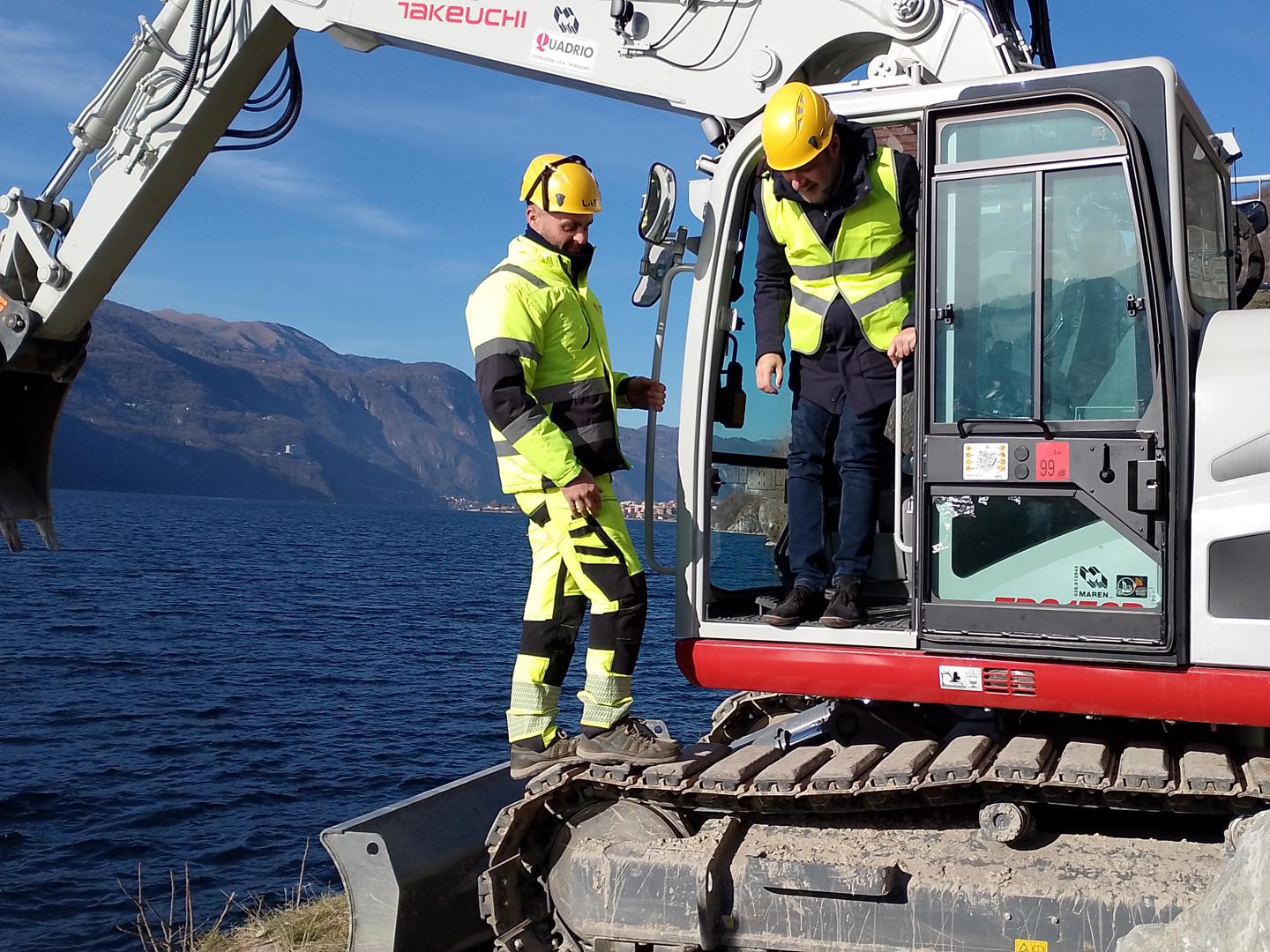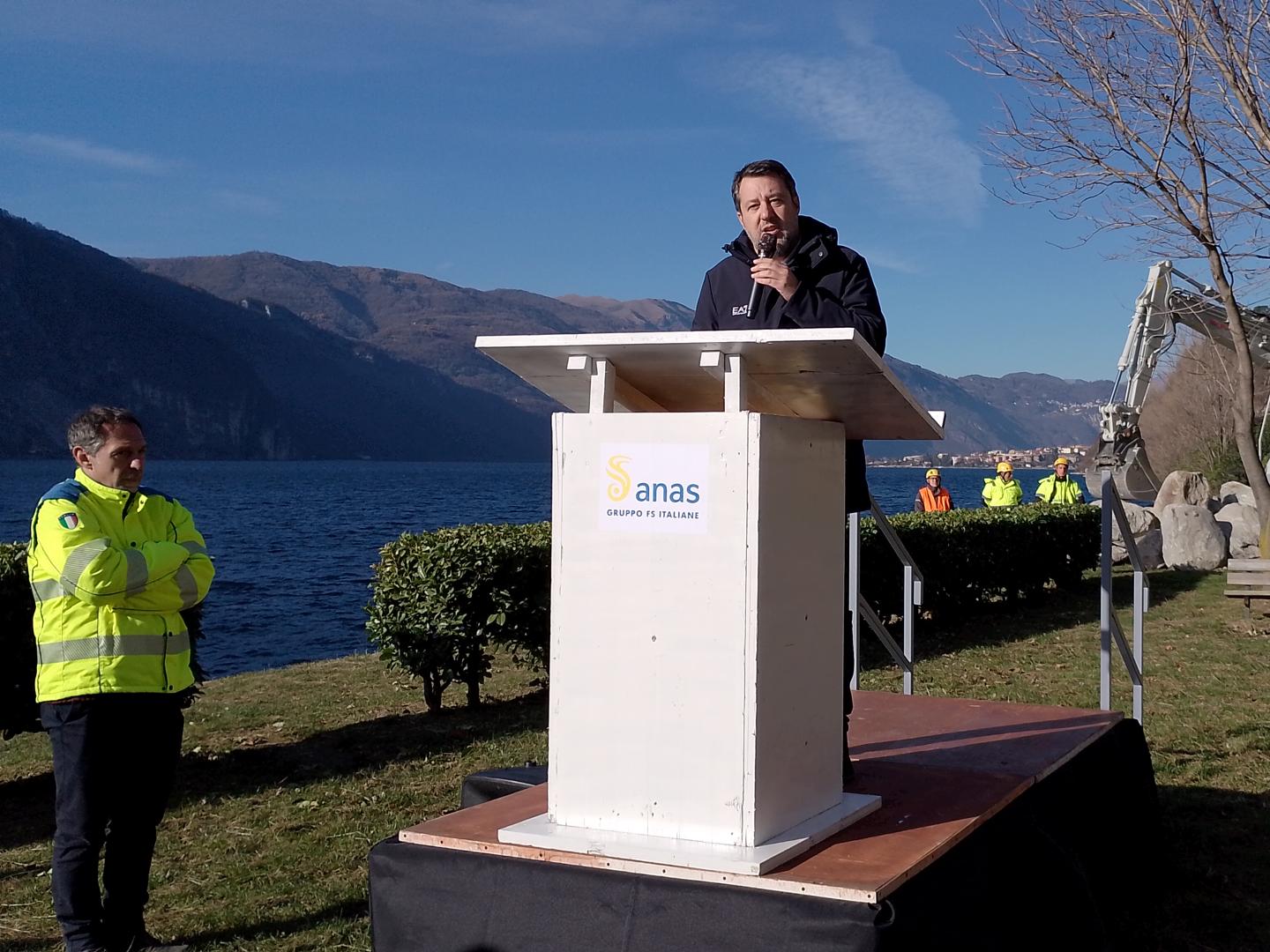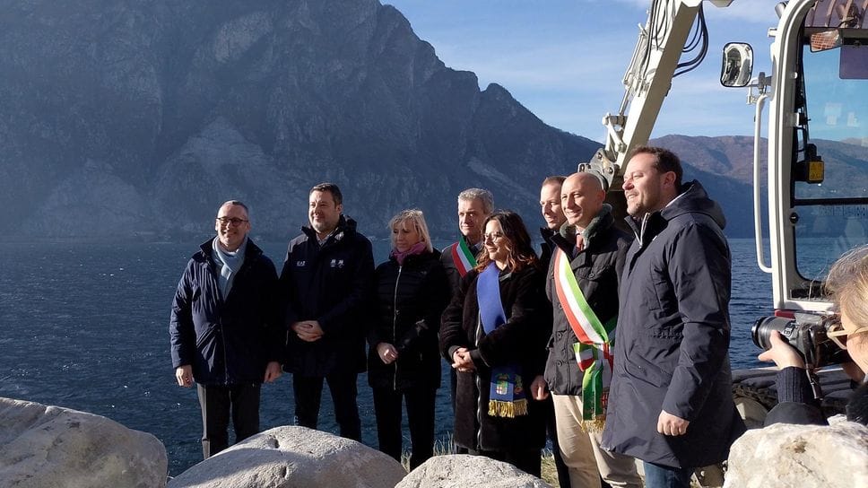 Una grossa pietra tipica delle scogliere di lago fatta scivolare in acqua direttamente dal ministro delle Infrastrutture e dei Trasporti Matteo Salvini, che ieri mattina è salito su un escavatore per dare simbolicamente il via ai lavori della passerella ciclopedonale, opera strategica pari a un quadro economico di 32 milioni di euro, che collegherà Abbadia Lariana con Lecco e toglierà ciclisti e pedoni dalla statale 36.