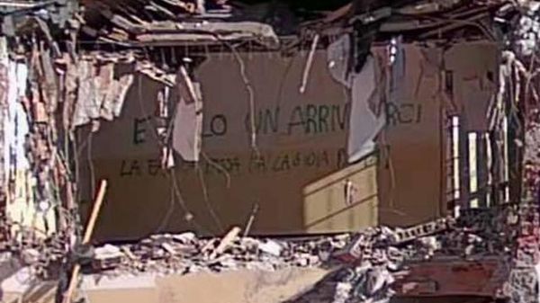 Seconda settimana per le opere di demolizione. Su un muro spunta una scritta lasciata dai giovani. L’arciprete: «Per distruggere ci vorrà un mesetto, per ricostruire un anno. Ma è così anche nella vita».