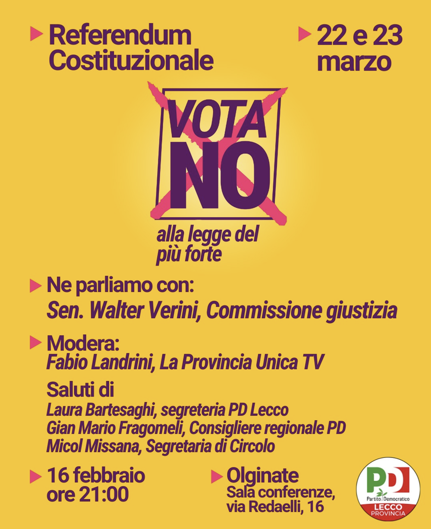 Un appuntamento che chiama in causa la Costituzione, la democrazia e il diritto di voto. A poco più di un mese dal referendum costituzionale, in programma il 22 e 23 marzo, Olginate ospita una serata di confronto pubblico dal titolo chiaro e diretto: “Vota No alla legge del più forte”.