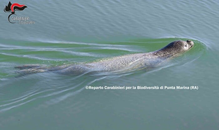 (ANSA) - RAVENNA, 02 DIC - I carabinieri del reparto Biodiversità di Punta Marina Terme, sul litorale ravennate, durante un servizio di perlustrazione, hanno visto emergere dalle acque poco profonde vicino a una spiaggia inserita in una riserva naturale dello Stato, un raro esemplare di foca monaca (Monachus monachus).