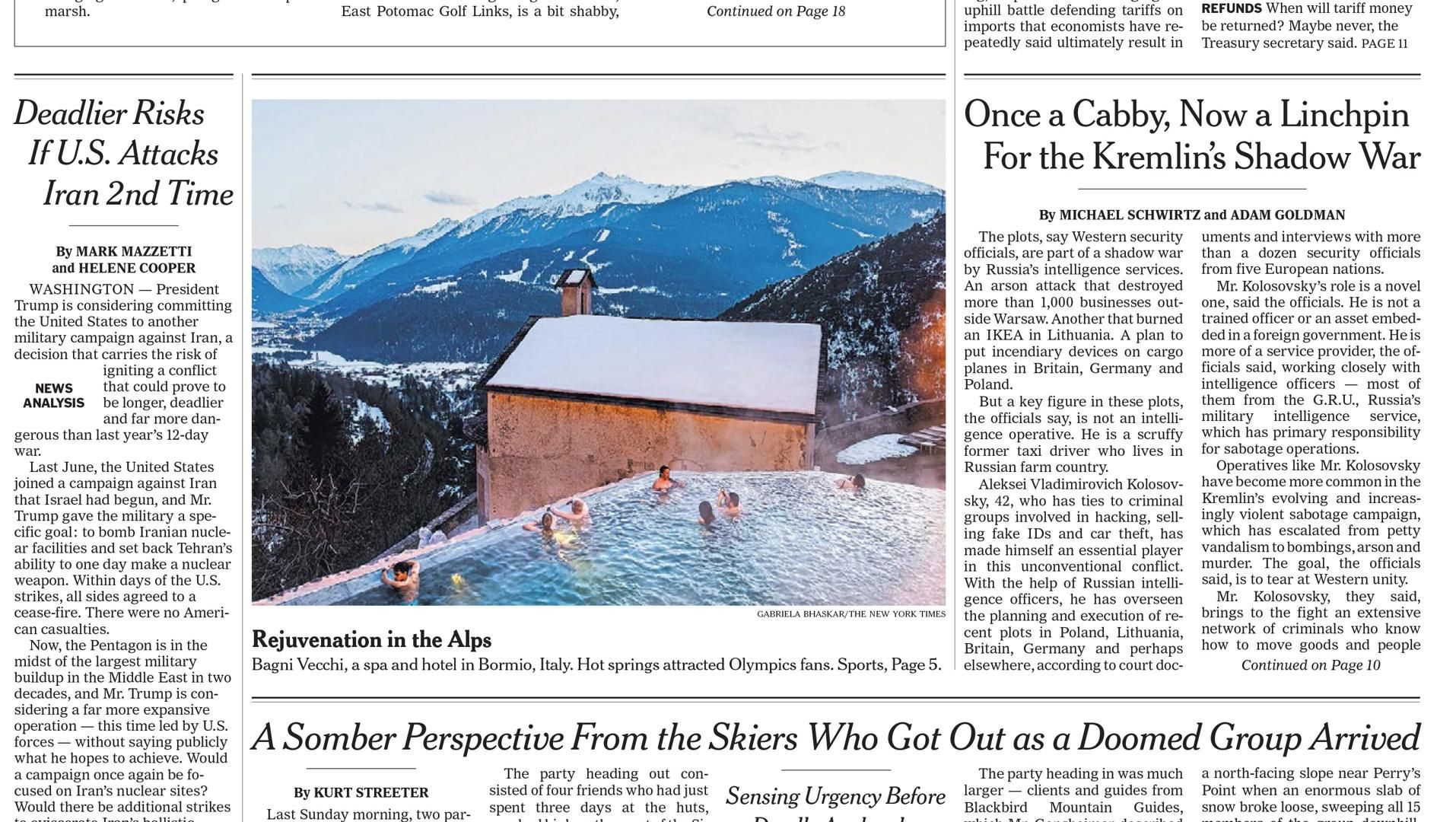 Proprio la testata statunitense, dopo aver parlato dei pizzoccheri domenica, ha caratterizzato la sua prima pagina con le acque termali parlando dei Bagni Vecchi. Perché il team della media lounge, oltre a occuparsi dell’accoglienza nella struttura, ha raccontato – e dato la possibilità a tanti giornalisti di raccontare – il territorio valtellinese attraverso degustazioni, momenti di scoperta e tante attività collaterali: le terme, la visita alle cantine dell’amaro Braulio, ciaspolate, sciate in notturna, passeggiate tra le meraviglie del centro storico, e tanto altro ancora.